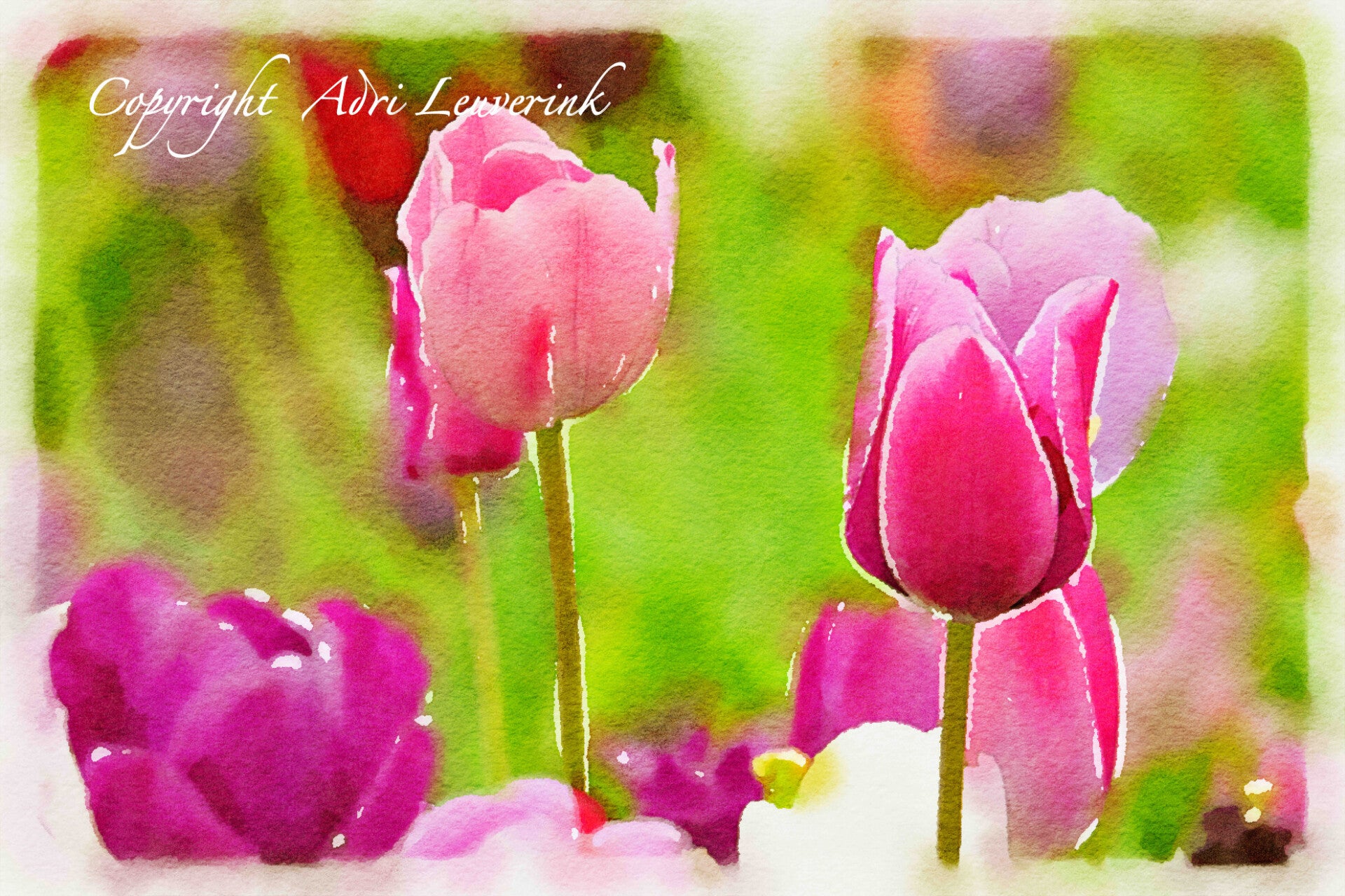 Dutch Tulips, onze Hollandse trots. Door Adri gefotografeerd en kunstzinnig bewerkt in prachtige EYECATCHERS vol met happy makende kleuren. Prachtige wanddecoraties voor in Uw interieur. Leverbaar als Artistpaneel, Artistpaneel, op glas, op planken, etc......